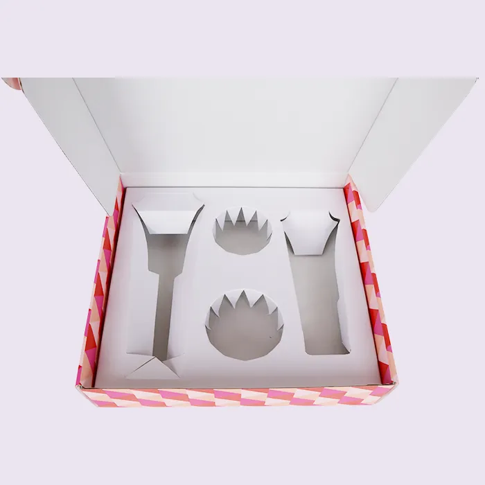 प्याकेजिङ घुसाउनका लागि, हामीले धेरै सामग्रीहरू विचार गर्यौं: कागज, प्लास्टिक, फोम, र पर्यावरण-मैत्री मोल्डेड इन्सर्ट। अन्ततः, हामीले तिनीहरूको कम मूल्य, छिटो टर्नअराउन्ड समय, सरलता, र पर्यावरण-मैत्री, बायोडिग्रेडेबल प्रकृतिको लागि पुन: प्रयोग गर्न मिल्ने पेपर इन्सर्टहरू चयन गर्यौं। व्यक्तिगत हेरचाह ढुवानी बक्सहरूको लागि कागज सम्मिलितहरू अनुकूलन मोल्डहरू आवश्यक पर्दैन, त्यसैले कुनै मोल्ड शुल्कहरू आवश्यक पर्दैन। Doyoupack को प्याकेजिङ्ग डिजाइनरहरूले नमूनामा आधारित आयामहरू, स्लटहरू, ट्याबहरू, र इन्टरलकिङ सुविधाहरू अनुकूल-फिट गर्छन्, र त्यसपछि डाइ-कटिङ मार्फत सम्मिलित उत्पादन गर्छन्। कागज सम्मिलित एक-टुक्रा नालीदार सामग्री हो - लागत-प्रभावी, पूर्ण बायोडिग्रेडेबल, र अत्यधिक पर्यावरण-मैत्री। यसले उत्पादनलाई राम्रोसँग प्रदर्शन मात्र गर्दैन तर समर्थन र सुरक्षा पनि प्रदान गर्दछ। सबैभन्दा महत्त्वपूर्ण कुरा, यसले इको-मोल्डेड इन्सर्टहरू, प्लास्टिक इन्सर्टहरू, वा ग्रेबोर्ड इन्सर्टहरूको तुलनामा उत्पादन सेटको समग्र वजन घटाउँछ। एक-टुक्रा नालीदार सम्मिलित र एक-टुक्रा पर्सनल केयर ढुवानी बक्सहरूले पनि फ्ल्याट यातायातको सुविधा दिन्छ।